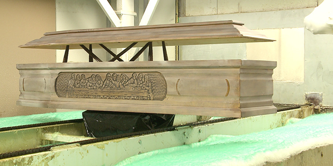 На виробництві абсолютний порядок і чистота. Спочатку дошкам надають правильної форми, потім вони йдуть до верстатів, де стають уже корпусами трун. Потім вироби облицьовують і шліфують. Бюджетні варіанти шпонують, а дорогі відправляють на тонування та покриття лаком. Після гарячої сушки – попереду ще кількадобова висушка остаточна. І нарешті готова продукція у всій своїй красі – в палітрі від білого до найтемніших кольорів – дістається складу, де її ретельно й бережливо запаковують аби не пошкодити дзеркальну поверхню, а потім уже складують задля подальшої відправки похоронним домам і ритуальним бюро як у самій Угорщині, так і за кордоном.