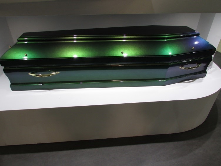 Американських виробників максі трун та саркофагів ми, на жаль, не побачили. А так хотілося з ними та їхнім товаром познайомитися поближче. Схоже, ці компанії, як і американські виробники сингуматорів, зосередилися тепер окрім своїх переважно на азійських виставках похоронної індустрії, і, передусім у Шанхаї, Токіо, Джакарті, Сінгапурі та австралійському Мельбурні. Тобто в тих регіонах, де традиційно масовий попит на їхню дорогу продукцію.